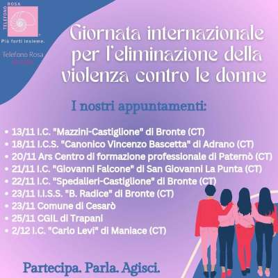 12 Novembre 2024Anche quest’anno, in occasione della Giornata Internazionale per l’Eliminazione della Violenza contro le Donne, sono in programma numerose iniziative di rilievo. Eventi, incontri e momenti di confronto si svolgeranno in diverse scuole e città, con l’obiettivo di riflettere, sensibilizzare e promuovere una cultura radicata nel rispetto e nella dignità. Un’occasione fondamentale per coinvolgere tutt